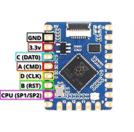 The pinout for the modchip lines of the RP2040-Tiny board are outlined and named in the image below.¶